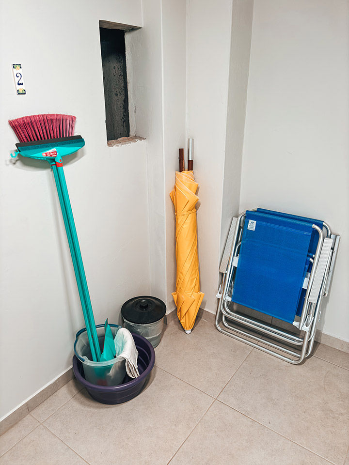Residencial Corsário - Studio 2 - Materiais de limpeza, cadeira de praia e guarda-sol.